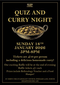 Come and join us for our exciting Quiz and Curry Night in the Community Building on 18th January, 5pm-8pm! We will be serving fabulous homemade curry and you can test your brain in our brilliant quiz, hosted by our very own vicar and game show extraordinaire, Rev Peter Nevins as the Quiz Master. We will be having teams of six, so bring your family and friends along. There will be a raffle where you can win lots of lovely prizes. Tickets are on sale from Eventbrite (Quiz and Curry Night – St John’s) at £10 per person including the delicious curry!